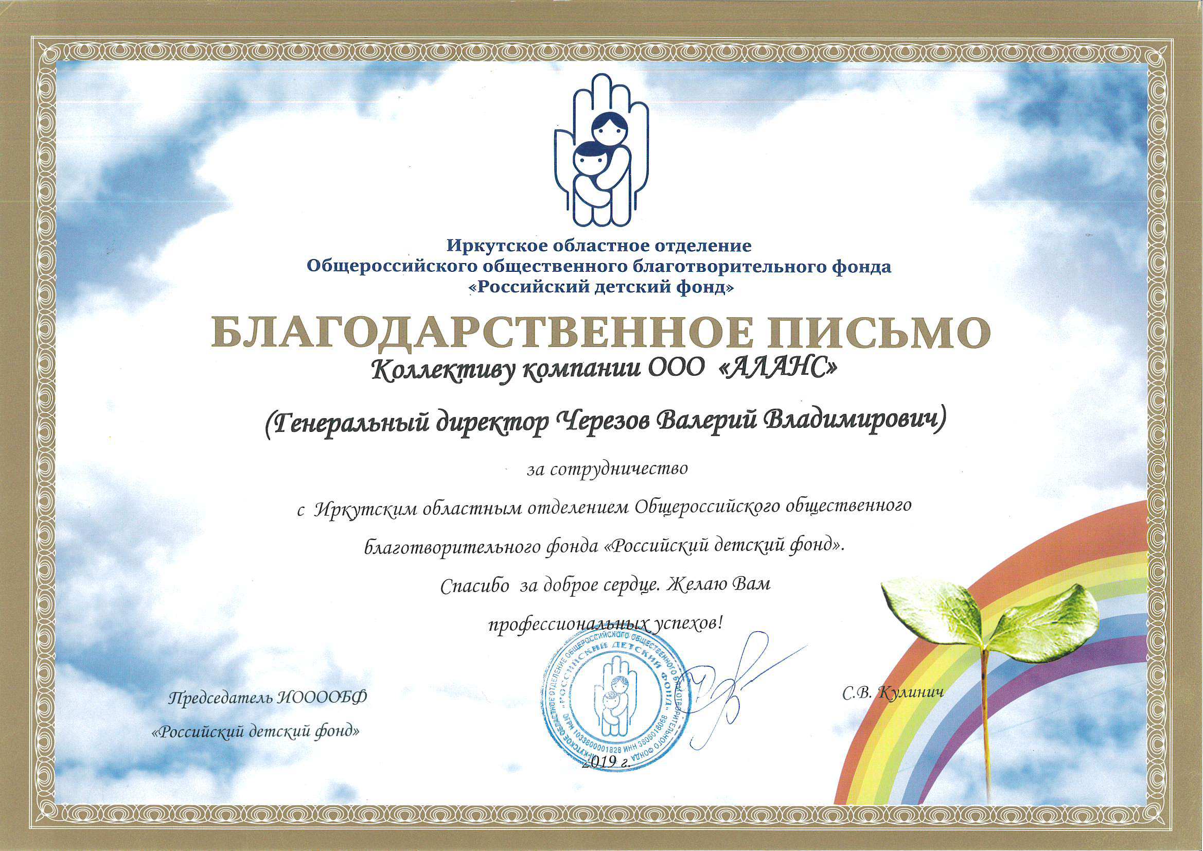Благодарственное письмо от благотворительного фонда "Российский детский фонд"