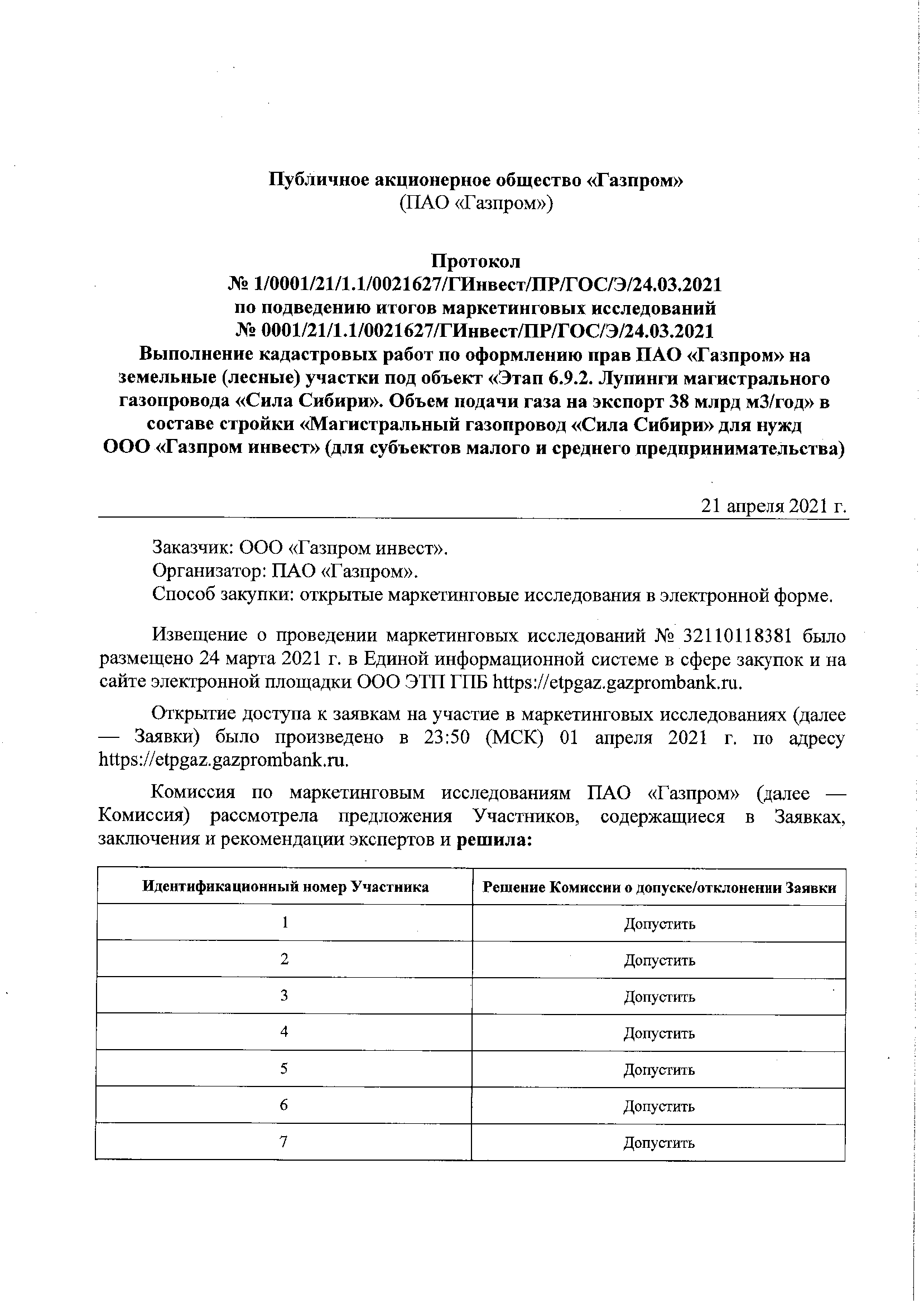 Подведены итоги открытых маркетинговых исследований ПАО «Газпром» - выполнение кадастровых работ по оформлению прав ПАО «Газпром» на земельные (лесные) участки под объект «Этап 6.9.2. Лупинги магистрального газопровода «Сила Сибири». Объем подачи газа на экспорт 38 млрд м3/год в составе стройки «Магистральный газопровод «Сила Сибири» для нужд ООО «Газпром инвест» (для субъектов малого и среднего предпринимательства).