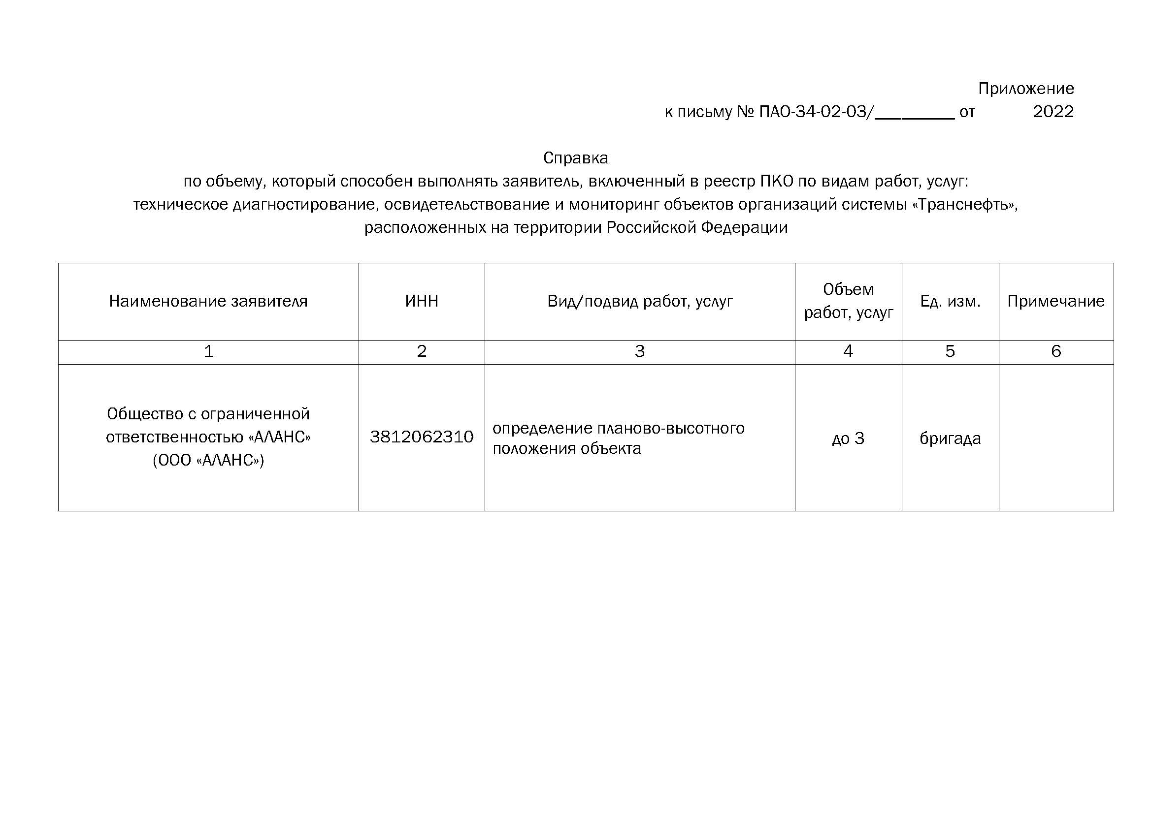ПАО «Транснефть» рассмотрело заявку ООО «АЛАНС» на предварительный квалификационный отбор, и по результатам оценки наша организация включена в реестр по виду работ «Определение планово-высотного положения объекта» для технического диагностирования, освидетельствования и мониторинга объектов организаций системы «Транснефть», расположенных на территории РФ.