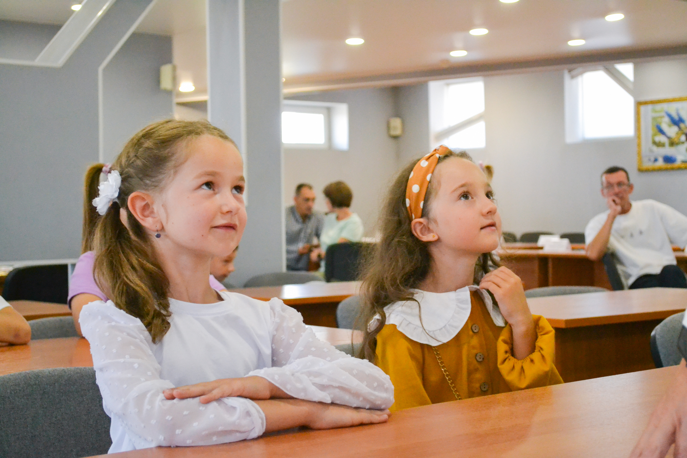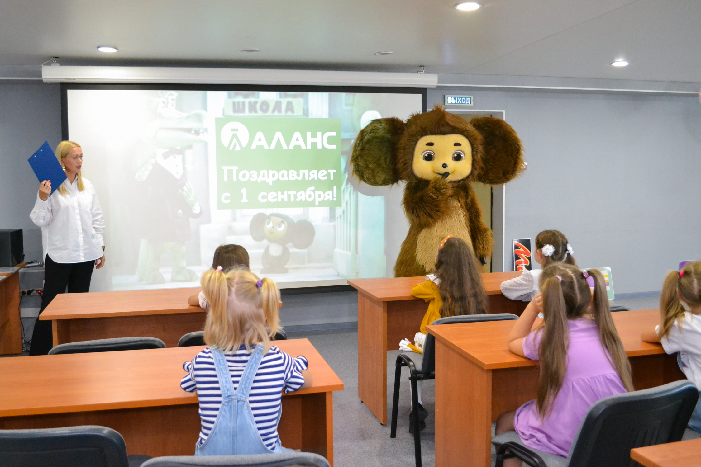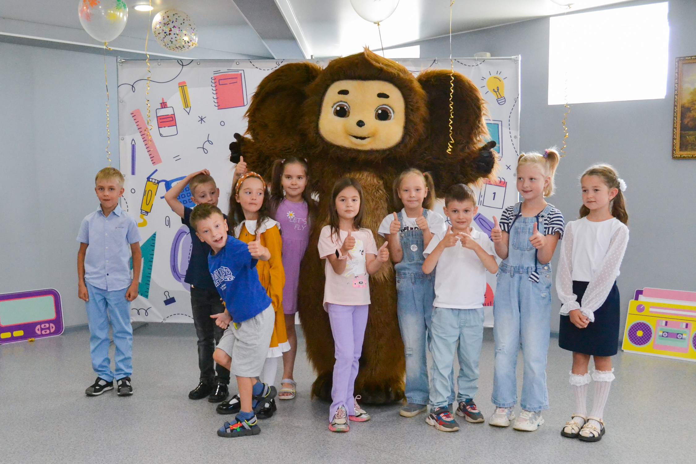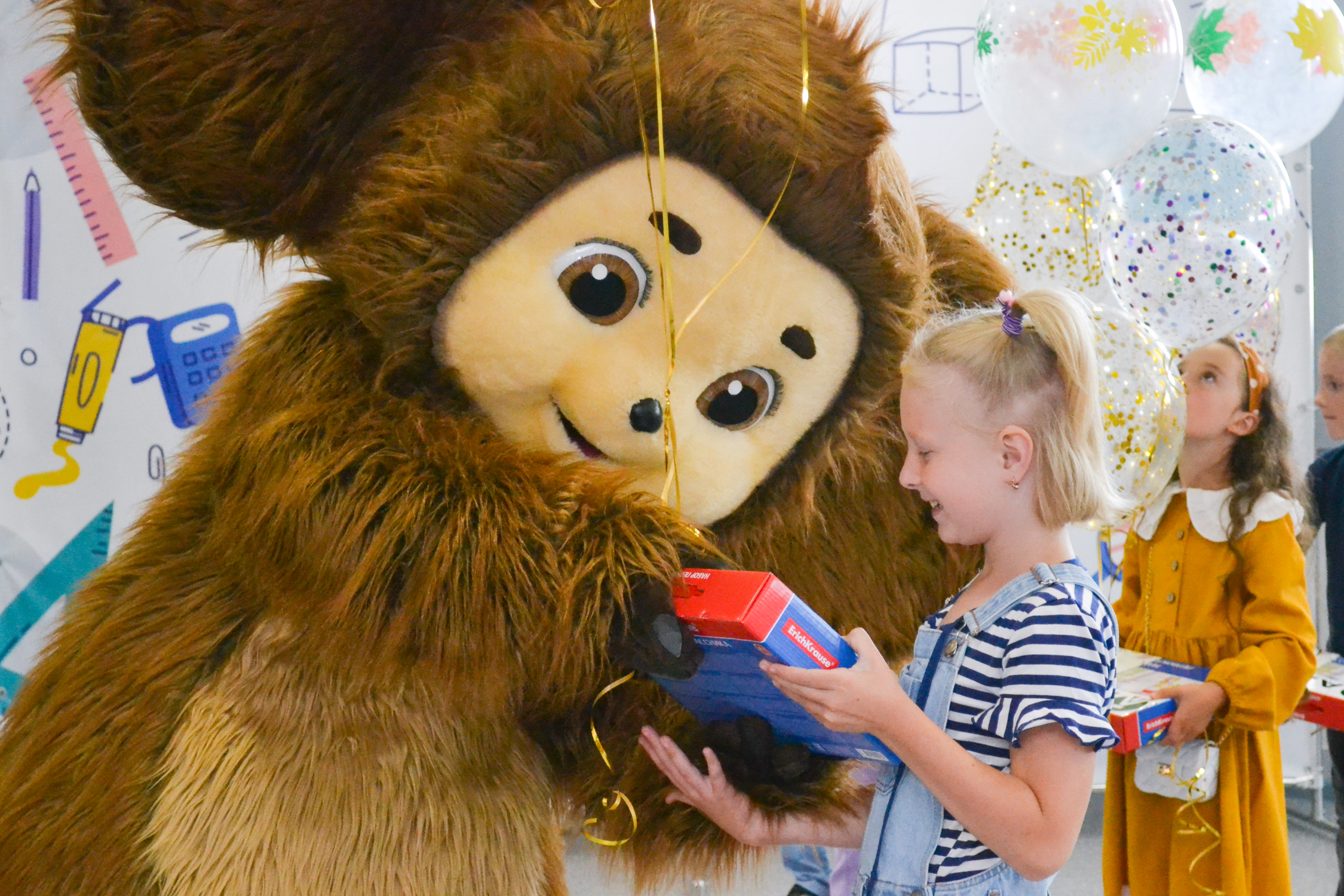 Конференц-зал компании на время превратился в школьный кабинет, а в гости к детям пришел Чебурашка. Ребята помогли ему справиться с каверзными задачками, после чего мохнатый гость так обрадовался, что принялся обнимать своих маленьких друзей и вручил каждому в подарок набор первоклассника.