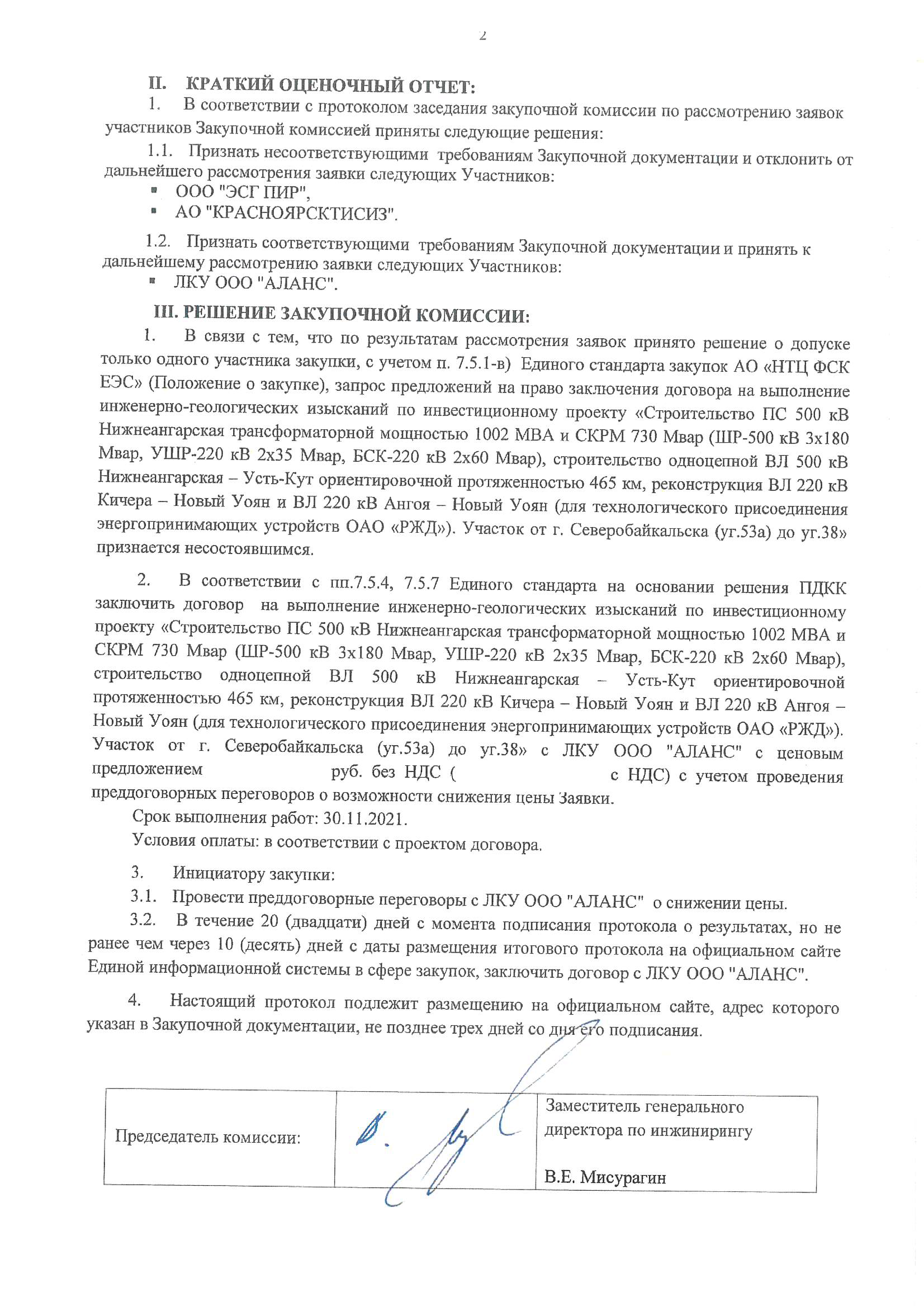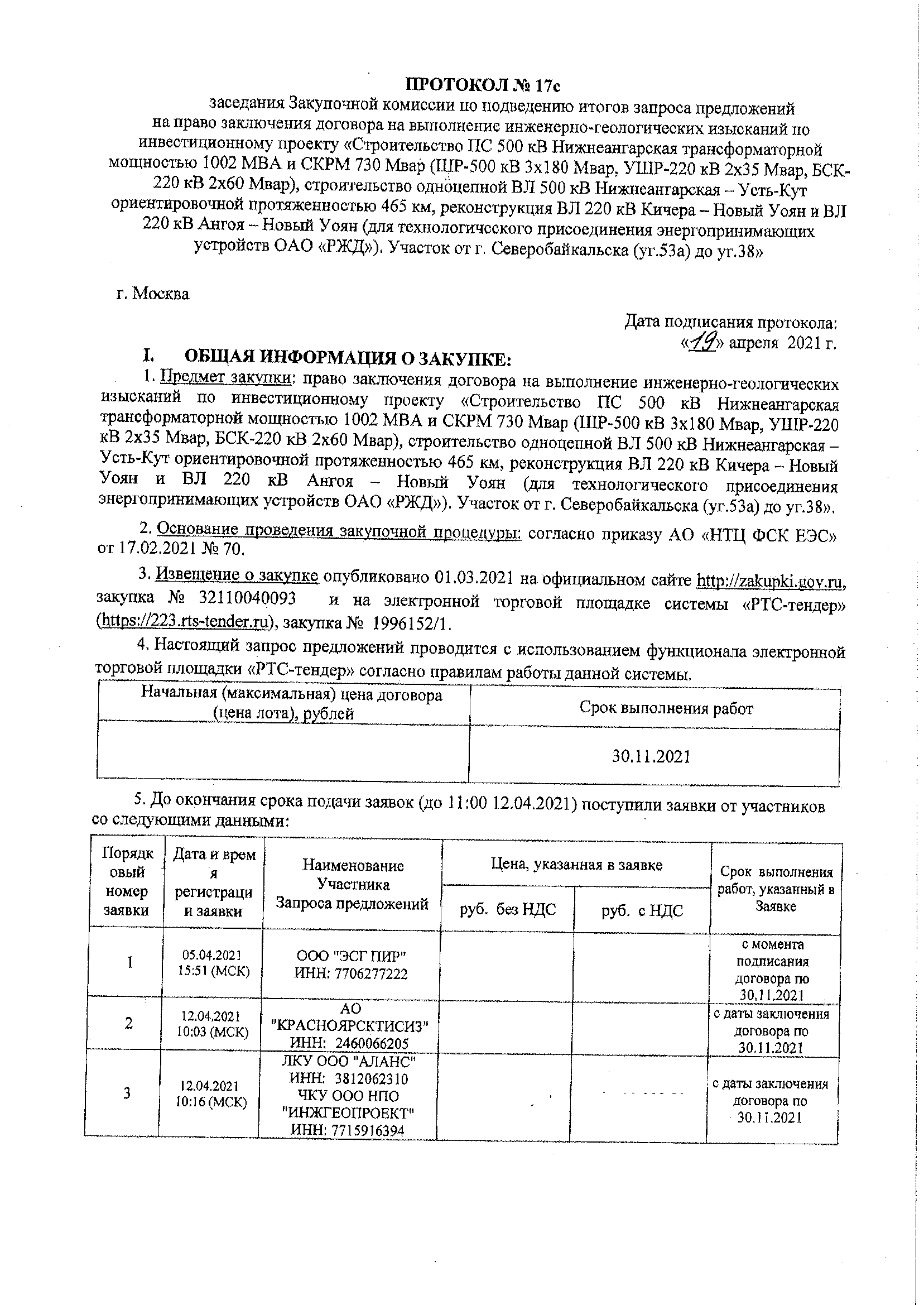 Получен протокол с результатами победы на право заключения договора по выполнению инженерно- геологических изысканий по инвестиционному проекту «Строительство ПС 500 кВ Нижнеангарская трансформаторной мощностью 1002 МВА и СКРМ 730 Мвар (ШР-500 кВ 3х180 Мвар, УШР-220 кВ 2х35 Мвар, БСК-220 кВ 2х60 Мвар), строительство одноцепной ВЛ 500 кВ Нижнеангарская – Усть-Кут ориентировочной протяженностью 465 км, реконструкция ВЛ 220 кВ Кичера – Новый Уоян и ВЛ 220 кВ Ангоя – Новый Уоян (для технологического присоединения энергопринимающих устройств ОАО «РЖД»). Участок от г. Северобайкальска (уг.53а) до уг.38».