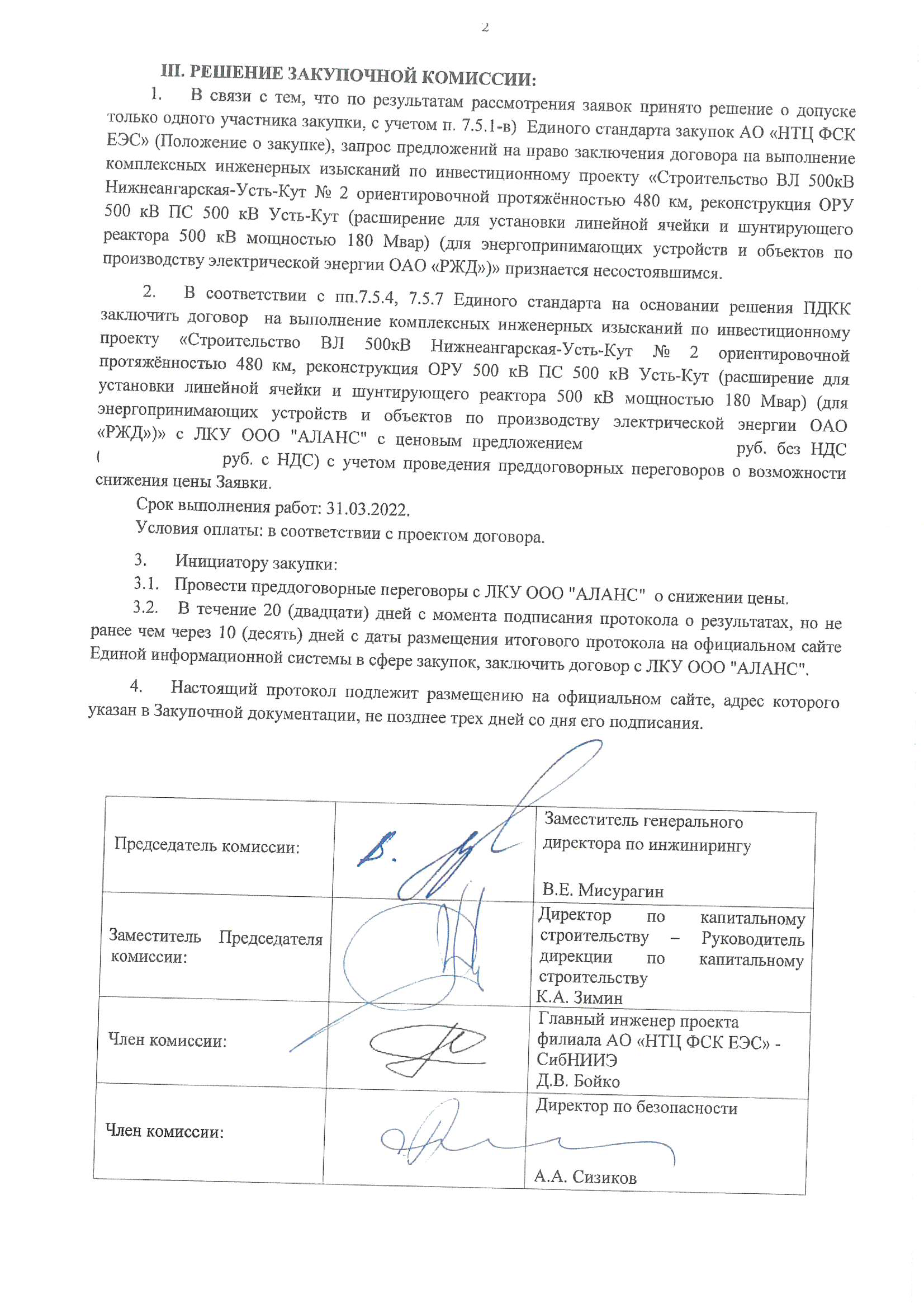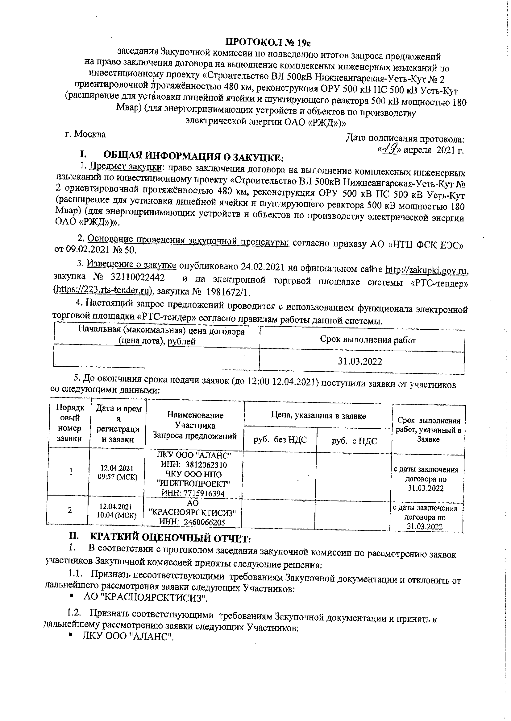 Получен протокол с результатами победы на право заключения договора по выполнению комплексных инженерных изысканий по инвестиционному проекту «Строительство ВЛ 500кВ Нижнеангарская-Усть-Кут № 2 ориентировочной протяжённостью 480 км, реконструкция ОРУ 500 кВ ПС 500 кВ Усть-Кут (расширение для установки линейной ячейки и шунтирующего реактора 500 кВ мощностью 180 Мвар) (для энергопринимающих устройств и объектов по производству электрической энергии ОАО «РЖД»)».